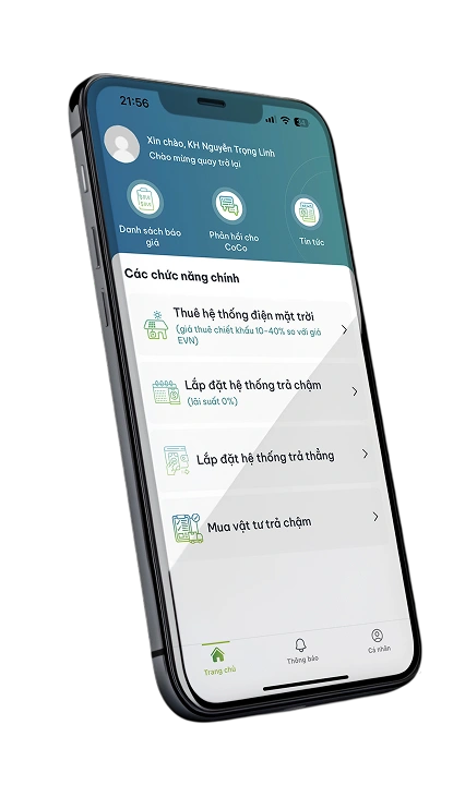 CoCo Solar là ứng dụng công nghệ sử dụng trí tuệ nhân tạo (AI) để tính toán báo giá điện mặt trời và phân tích hiệu quả đầu tư tài chính cho khách hàng chỉ trong vài phút. Khách hàng có thể theo dõi mọi quy trình từ tư vấn, lắp đặt điện mặt trời, thanh toán đến bảo hành trên ứng dụng một cách minh bạch và dễ dàng.